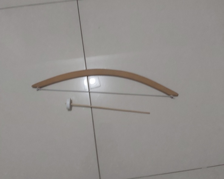 Pegue o cabide (só o arco) , amarre a corda elástica no arco.