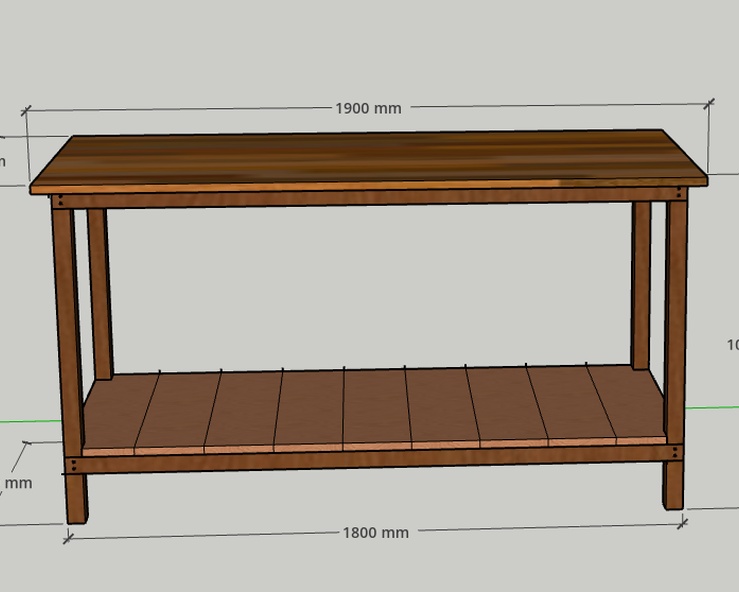 - Pés - 4 caibros 50mm X 70mm X 1000mm (na preparação eu corto o equivalente a espessura do tampo para alcançar a altura planejada de 1000mm)