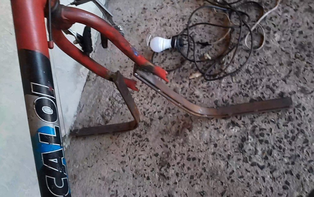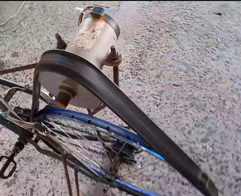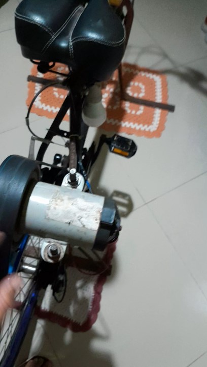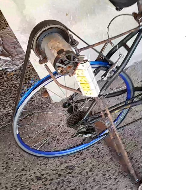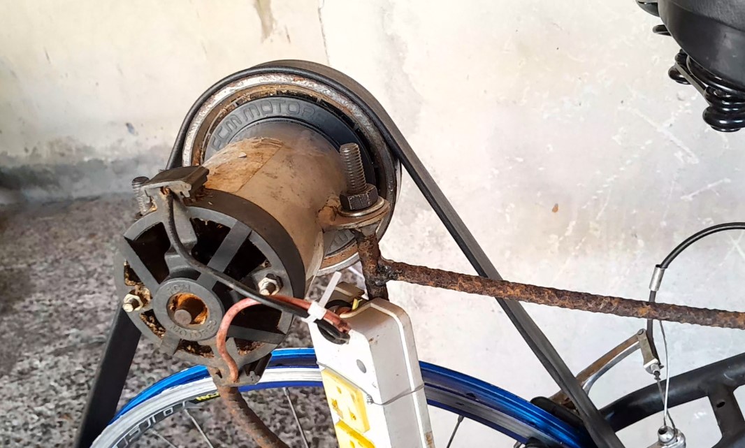 Bicicleta geradora de energia, com um motor de esteira, é capaz de geral até 127V em alta rotação, uma bicicleta normal soldado a apoios a fim de se tornar ergométrica e retirar a roda do contato do chão com a roda traseira funcionando com polia ligada ao gerador.