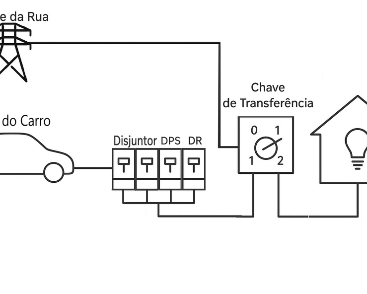 É importante que a chave de transferência seja de 4 polos e suporte a tensão e corrente da instalação da casa (geralmente 220V e até 16A, conforme o limite do V2L). Os cabos devem ter bitola adequada para essa corrente, e o sistema deve contar com disjuntores de classe A, garantindo sensibilidade e segurança para pessoas e equipamentos.