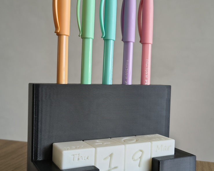Um calendário composto de cubos e uma base que serve como porta canetas com capacidade de até 5 canetas. Feito 100% na impressão 3d. Para um acabamento simples, não recomendo utilizar suportes (como na imagem) e para um acabamento mais refinado, recomendo a utilização de suportes (se tiver prática).