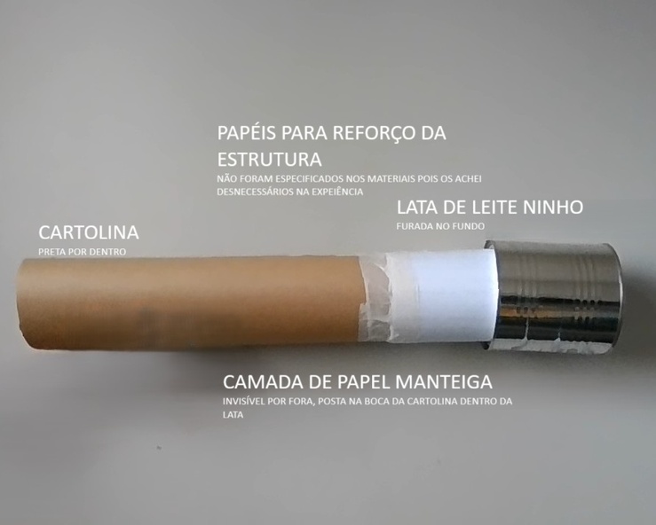 Também é importante saber que você deve olhar pela boca onde não há o papel manteiga ( pois esse deve estar lá no fundo da lata), e que a regulação da distancia do cilindro até a lata é regulável. Então não se assuste se ao for observar uma paisagem ela se tornar um ponto branco, caso isto aconteça distancie um pouco o cilindro do furo da lata, assim a imagem aparecerá!