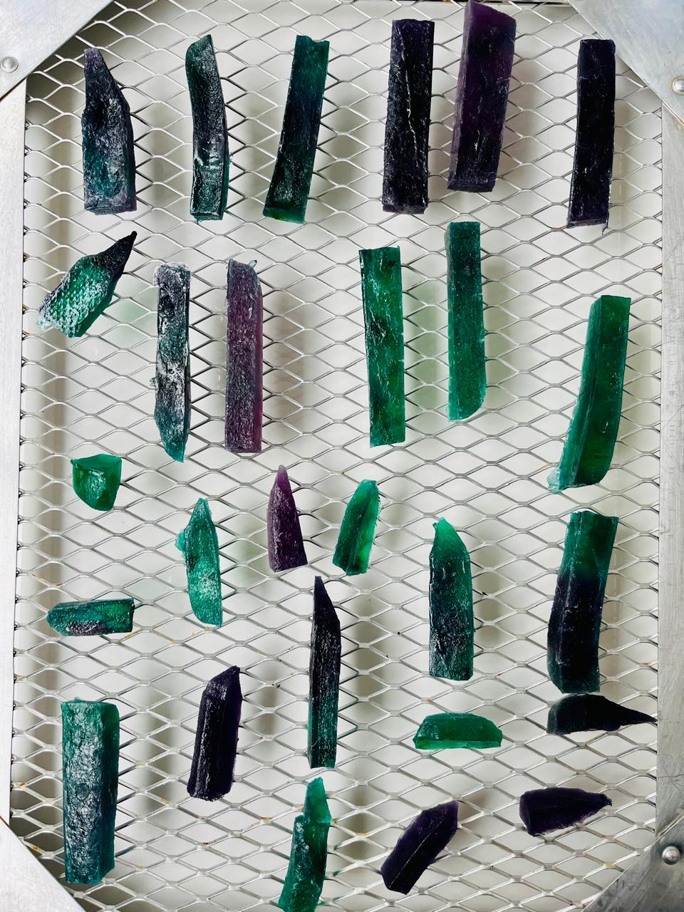 Deixe os cristais secarem naturalmente por 3 a 7 dias, virando-os ocasionalmente até que se forme uma casquinha crocante na superfície. Se tiver um desidratador, o processo fica muito mais rápido. Quando os pedaços estiverem firmes o suficiente para manusear sem deformar, transfira-os para uma grade culinária (opcional) para que o ar circule por todos os lados e a secagem finalize de maneira uniforme.