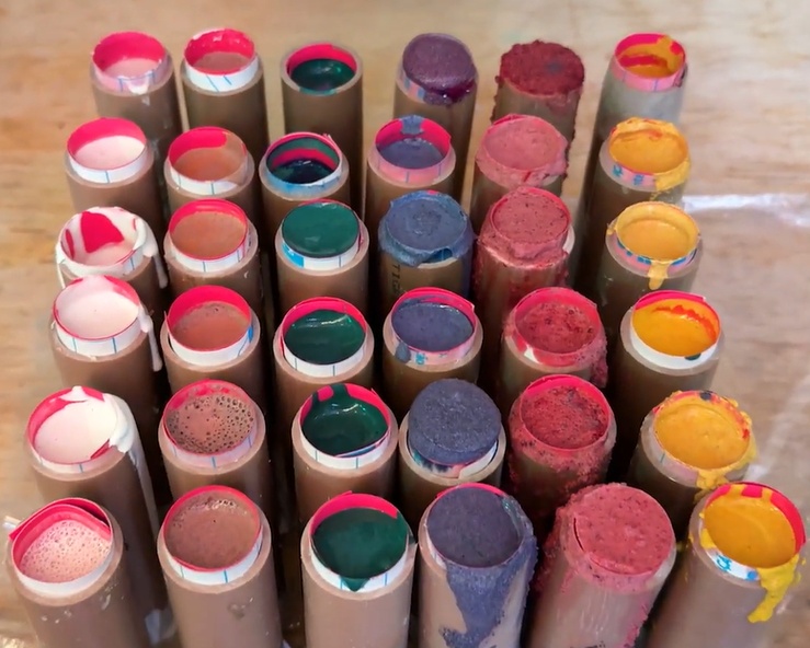 Produza giz de lousa caseiro usando materiais como gesso, terra peneirada e pigmentos naturais, explorando diferentes misturas para testar dureza, cor e capacidade de escrita. Na foto você pode ver alguns testes coloridos que utilizaram pigmentos orgânicos. Na conclusão explicamos por que estes não deram certo.