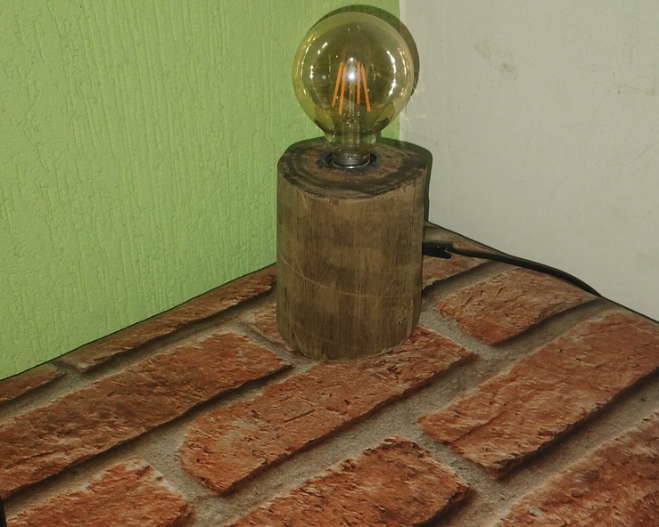 É uma luminária estilosa feita apenas com um toco de madeira, podendo ser de palete ou um pedaço de tronco, com uma lâmpada com aquela luz amarelada.