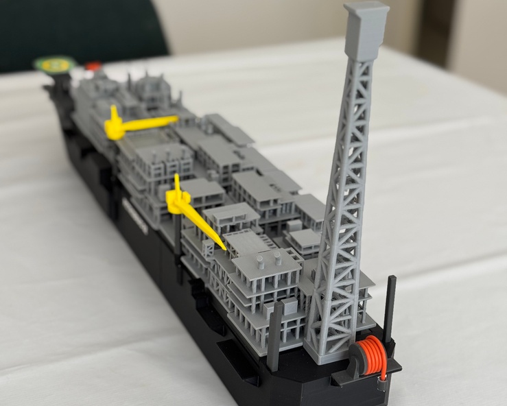 A ideia deste projeto foi mostrar que dá para pegar um modelo 3D bem complexo, simplificar tudo no Blender — que é gratuito — e deixá-lo pronto para impressão 3D. Além de render um objeto decorativo legal, o modelo também serve como material didático para entender suas partes — neste caso, uma plataforma de petróleo do tipo FPSO.