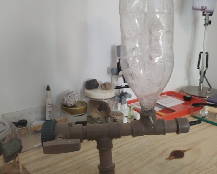 8- Colocar a garrafa no T Virado para cima e fure os dois ao mesmo tempo uns 5 mm abaixo da ponta do T