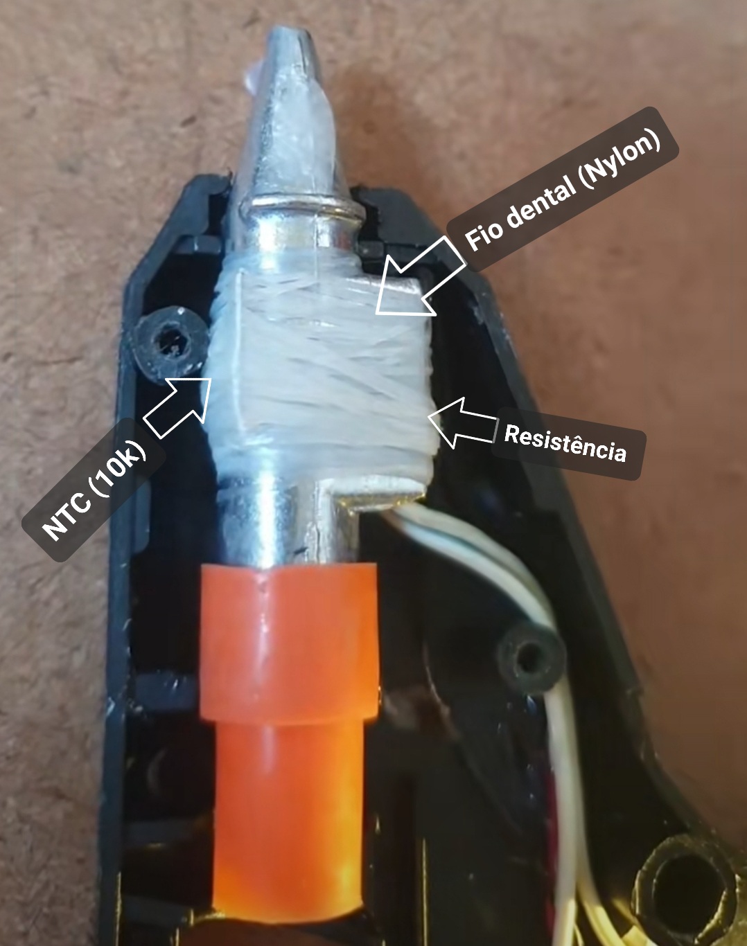 Dito isso, esse componente é exatamente do mesmo tamanho do elemento resistivo original, o que torna extremamente conveniente e fácil adaptar ele. Além disso, se faz necessário de aplicar pasta térmica e (opcional) pressionar e fixar tudo com fio dental (não derrete a temperatura da cola quente ~120ºC).
