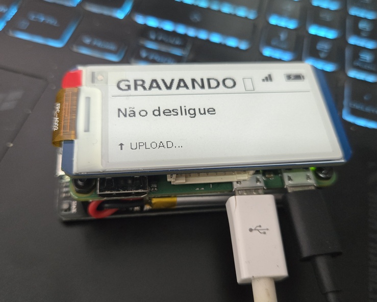 Interface Visual: Tela E-Ink (e-Paper) mostrando status de gravação, Wi-Fi e Bateria.