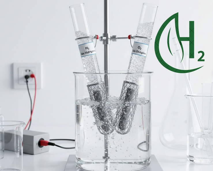 Produção de hidrogênio (H₂) a partir da eletrólise da água.