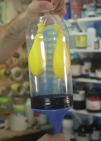 - Passe a mangueira com as bexigas por dentro da garrafa cortada até a outra ponta.