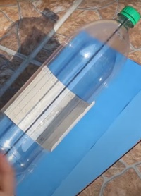 - Apoie a garrafa sobre a rampa a deixando bem alinhada, tampa apontando para o alto da rampa e fundo da garrafa apoiado sobre o isopor de apoio que foi colado na rampa, deixando as marcações no papel apontadas para cima, de forma que você as veja através da garrafa.
