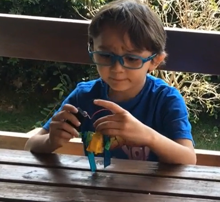 Ao ligar o motor, os quadradinhos giram alternadamente, movimentando os palitos de dente. Esse movimento é transferido para as pernas, fazendo com que uma suba enquanto a outra desce, criando o efeito de caminhada.