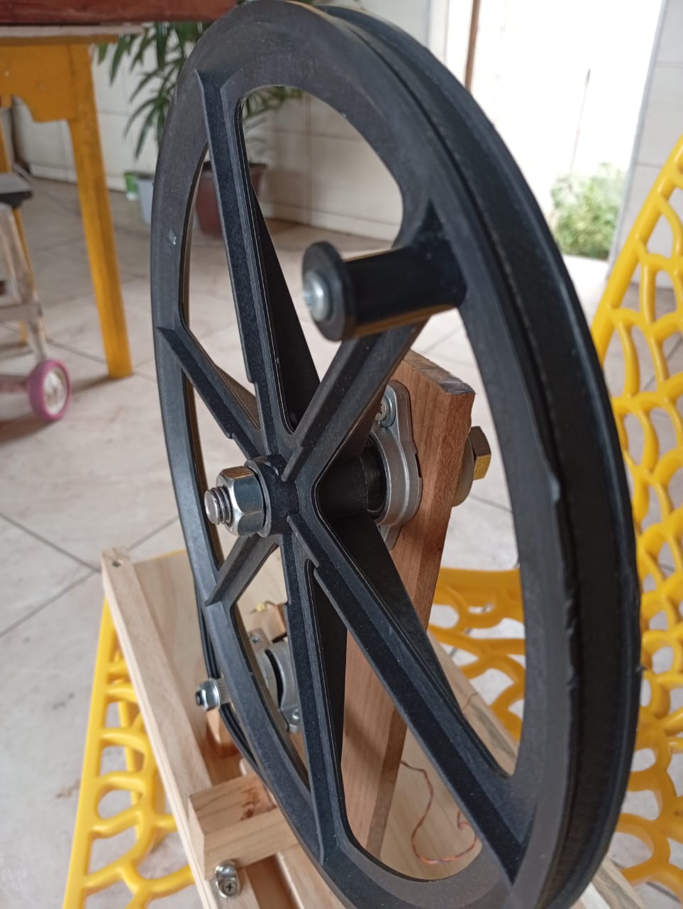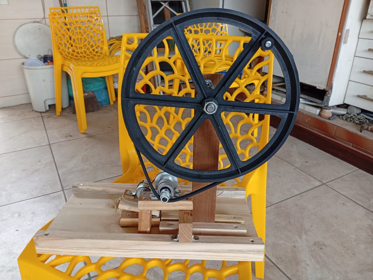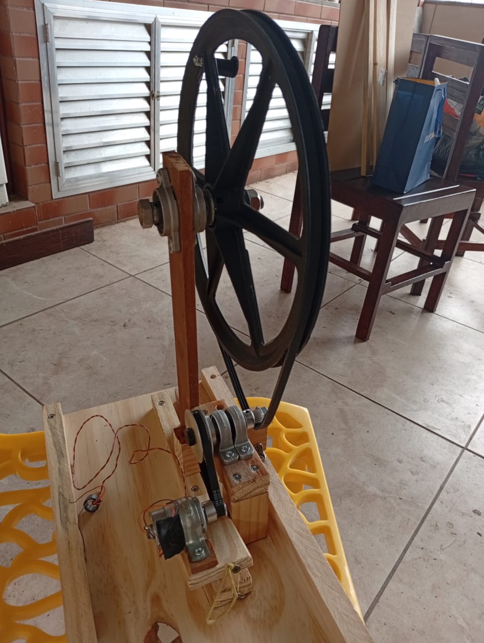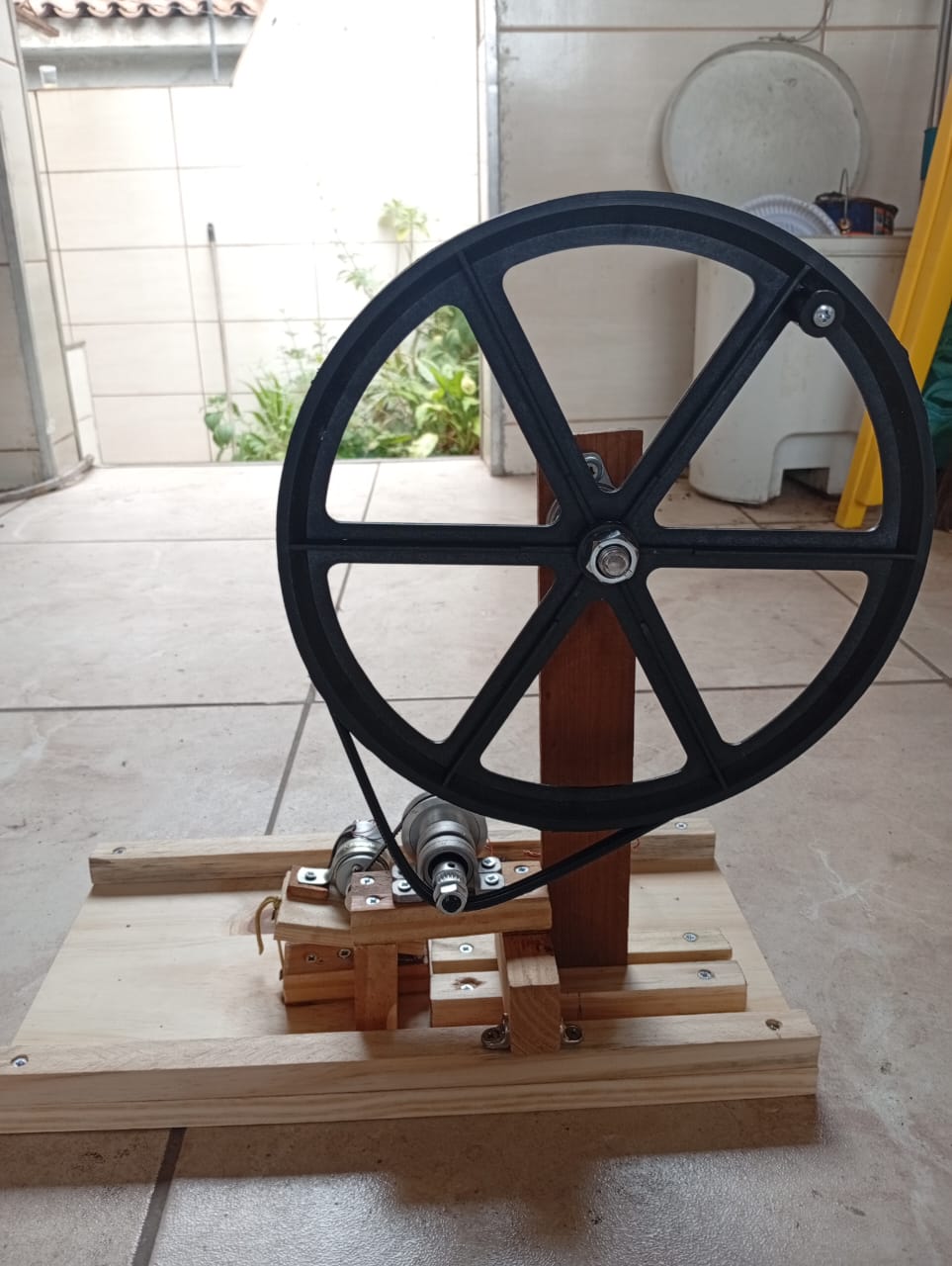 A ideia do projeto surgiu a partir de um pedido da professora da escola da minha filha mais velha (pré-escola), onde seria necessária uma máquina que acendesse uma luz de forma manual. O projeto foi desenvolvido para que as crianças pudessem gerar energia elétrica através do giro manual de uma polia ligada por correia ao eixo de um motor elétrico de impressora e assim trabalhar assuntos como sustentabilidade, trabalhar a coordenação motora uma vez que é necessário o giro da polia para geração da energia elétrica e trabalhar de forma lúdica assuntos relacionados à ciência e tecnologia, mesclando soluções de mecânica e eletromagnetismo.