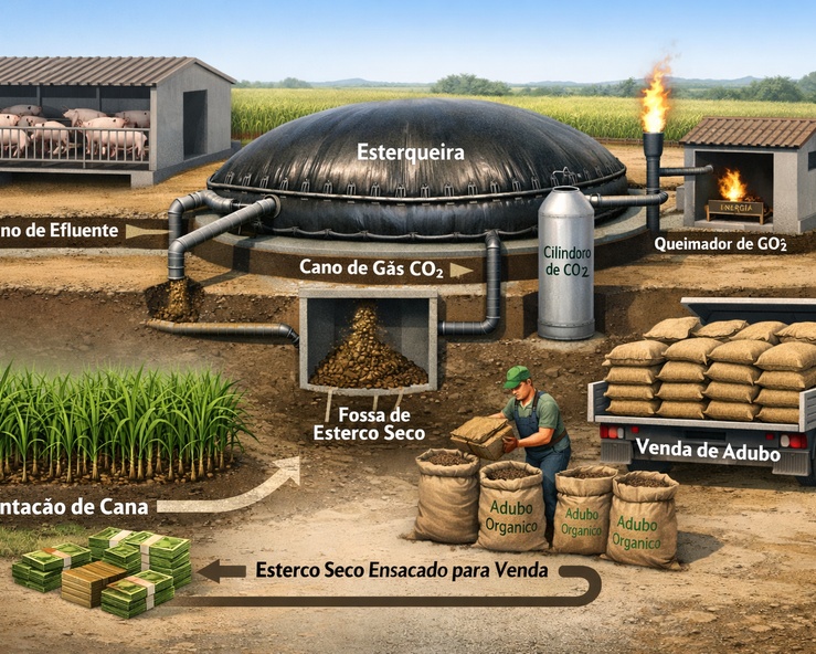 As fezes dos porcos [e dos outros animais] produz co2 que e inflamavel , por isso o esterco e levado para uma esterqueira fechada com uma lona , a lona aprisiona o co2 liberado pelo esterco e isso nos possibilita colocar uma valvula para o gas e para o esterco, o co2 e usado como combustivel para a queima do esterco , dessa maneira e mais facil para os fazendeiros usarem o esterco, apos a queima do esterco ele e levado para uma fossa para ser ensacado e levado para a venda em mercados agricolas ,com parte do dinheiro das vendas compra-se cana que serve como sequestrador de co2 e alimento para os porcos , alem disso os porcos podem ser vendidos ou carneados. Meu teclado esta com problemas , por isso nao tem assentos no texto. Deixem sugestoes de ideias para o projeto , estou pensando em fazer um video sobre.