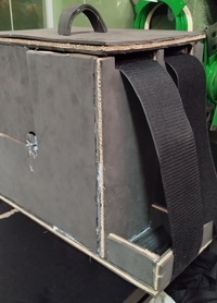É uma caixa de suporte para rolos de velcros macho e fêmea de 100mm de diâmetro. Fiz o projeto no SketchUp e fabriquei as caixas em papelão, E.V.A. e cola quente. Quase não tive gastos na fabricação pois foi com materiais baratos e reaproveitados.