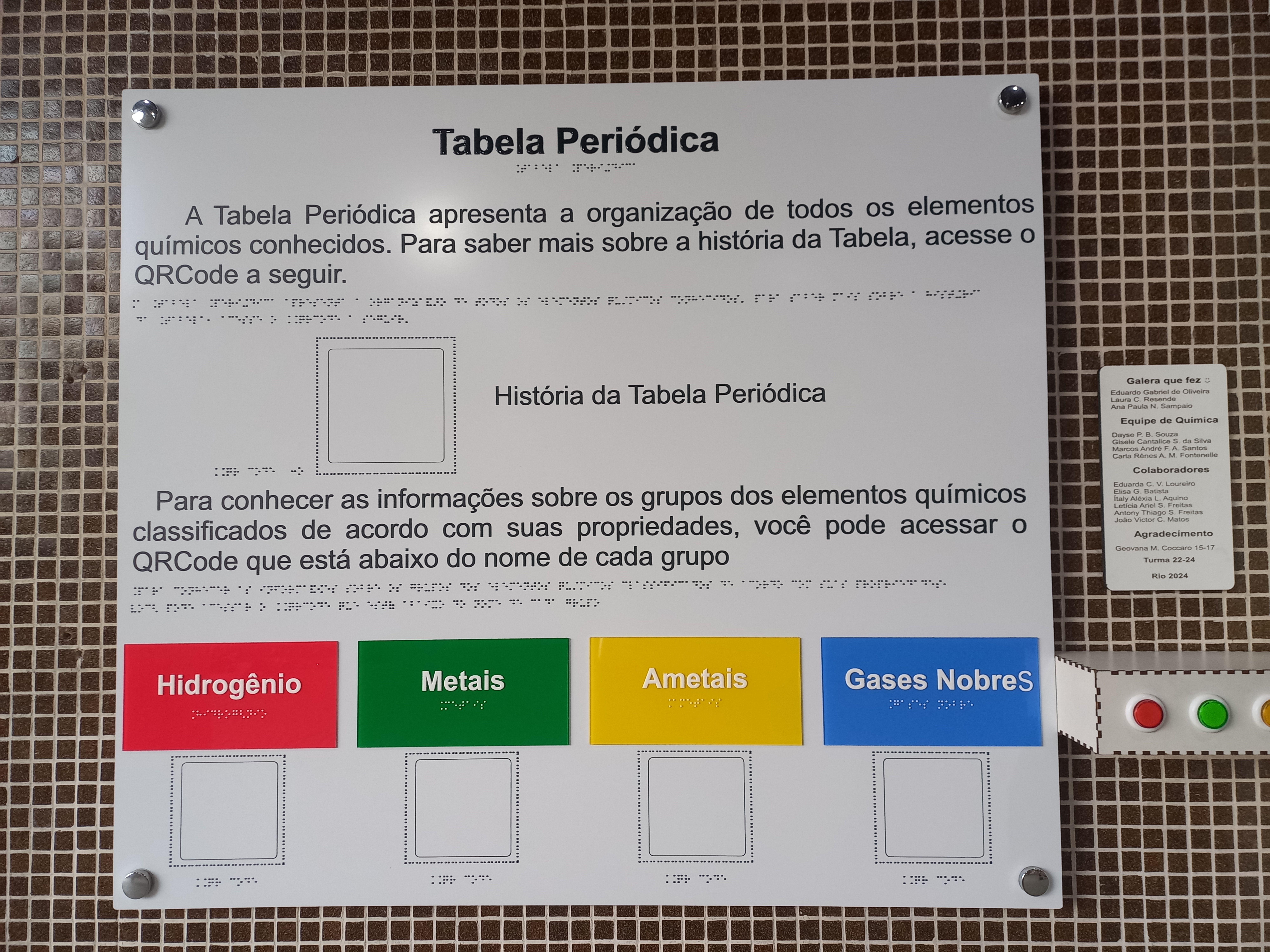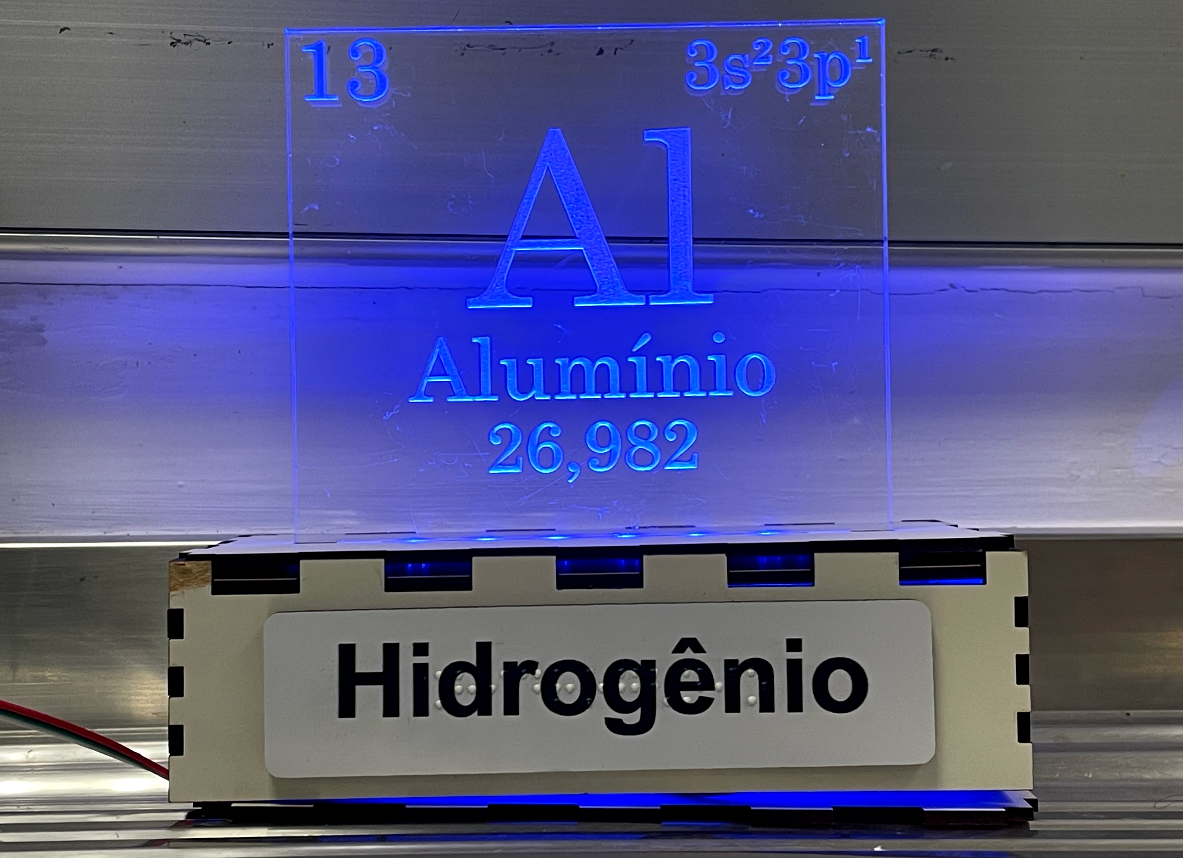 O projeto da Tabela Periódica Acessível transformou cada elemento químico em um módulo individual composto por uma caixa de MDF com uma fita de LED interna e uma placa de acrílico gravada com símbolo e número atômico. Na frente de cada caixa foi adicionada uma plaquinha com o nome do elemento em texto e em braile, garantindo acessibilidade. Toda a montagem eletrônica, organização das fitas, conexões e adaptação dos módulos foi planejada para que cada elemento acendesse corretamente e de forma independente, criando uma tabela periódica interativa, moderna e visualmente clara.