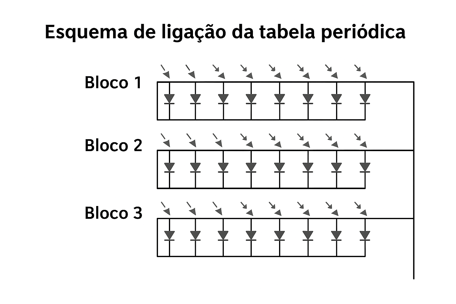 O projeto apresenta uma tabela periódica interativa em que cada grupo químico acende ao pressionar um botão.