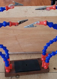 Um suporte para segurar peças a serem soldadas, coladas, trabalhadas. Super prático, com muitos graus de liberdade de movimento e quatro braços com pinças para segurar o que for necessário.
