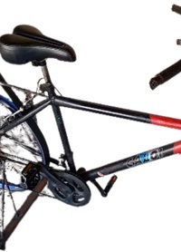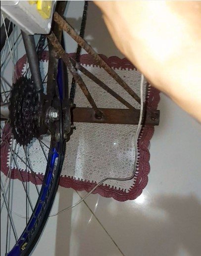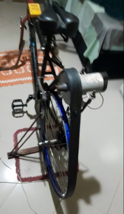 Bicicleta geradora de energia, com um motor de esteira, é capaz de geral até 127V em alta rotação, uma bicicleta normal soldado a apoios a fim de se tornar ergométrica e retirar a roda do contato do chão com a roda traseira funcionando com polia ligada ao gerador.