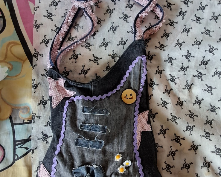 - Agora é a hora de soltar a criatividade e decorar sua bolsa, algumas coisa que eu considero obrigatorias, são os botoes, (que vão estar simulando o controle de tonaludade e o de volume), tambem essas 3 tiras de jeans que representam os captadores e a fonte, de resto faça como quiser!! S2
