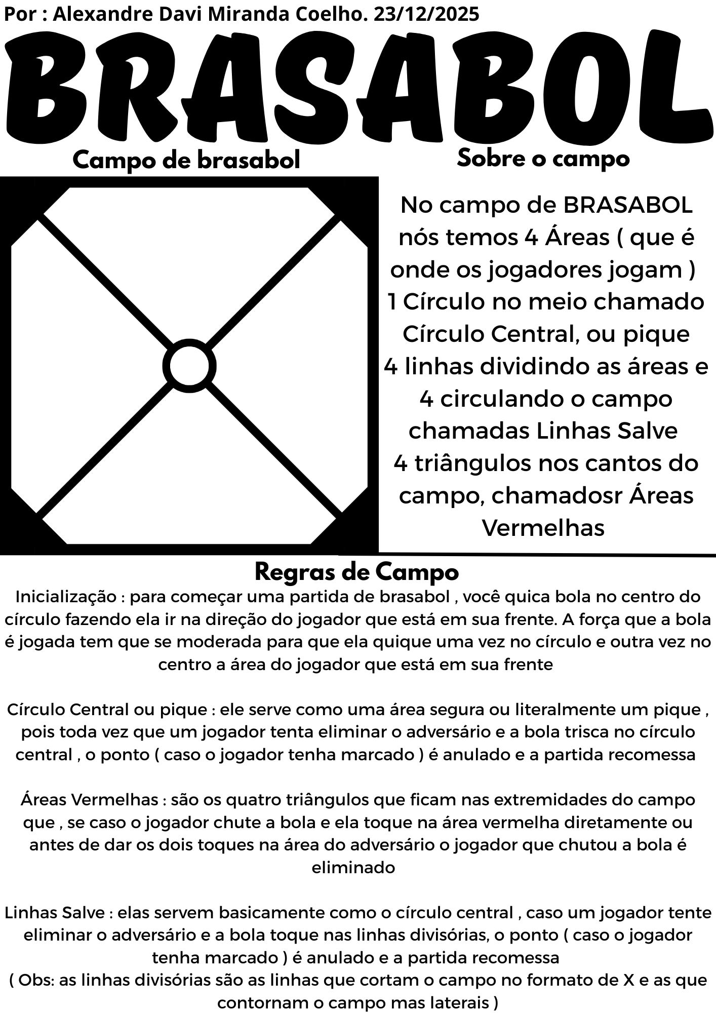 O brasabol é um jogo criado por mim nas férias de 2025, eu pensei nele enquanto estava estudando geometria na escola , pensei como poderia misturar ela com um esporte que gosto muito que é o fute-volei. Depois de muitas tentativas e erros e testes com meus amigos da minha rua , conseguirmos criar um novo jogo bem divertido e complexo , em que os jogadores jogam em 4 Áreas similares a forma geométrica de um diamante , que quando juntas com quatro triângulos nas extremidades , formam um quadrado perfeito. E assim se cria o campo de Brasabol