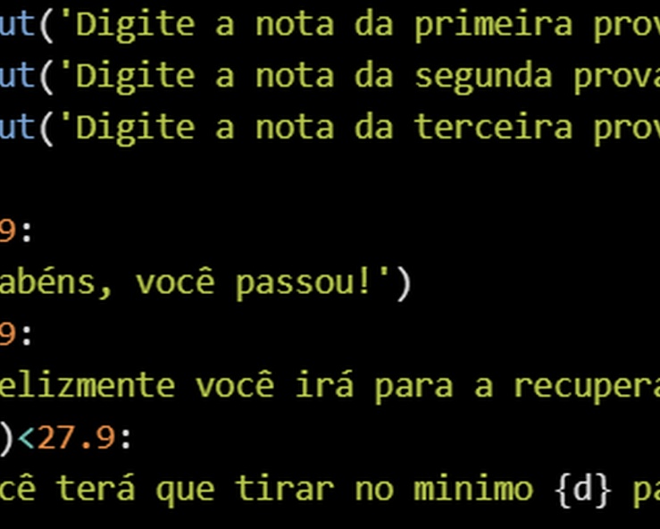 Primeiramente temos o input e o float que faz você poder digitar suas notas de forma decimal. Então temos o if que faz alternativas (se já passou, quanto falta ou se esta reprovado) -