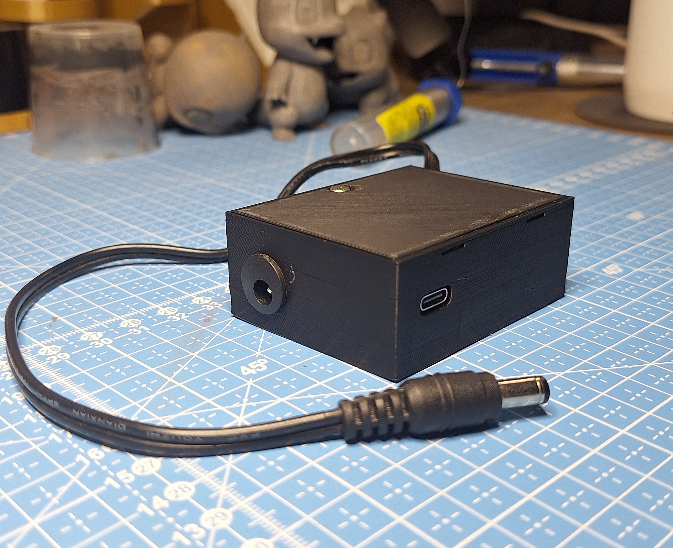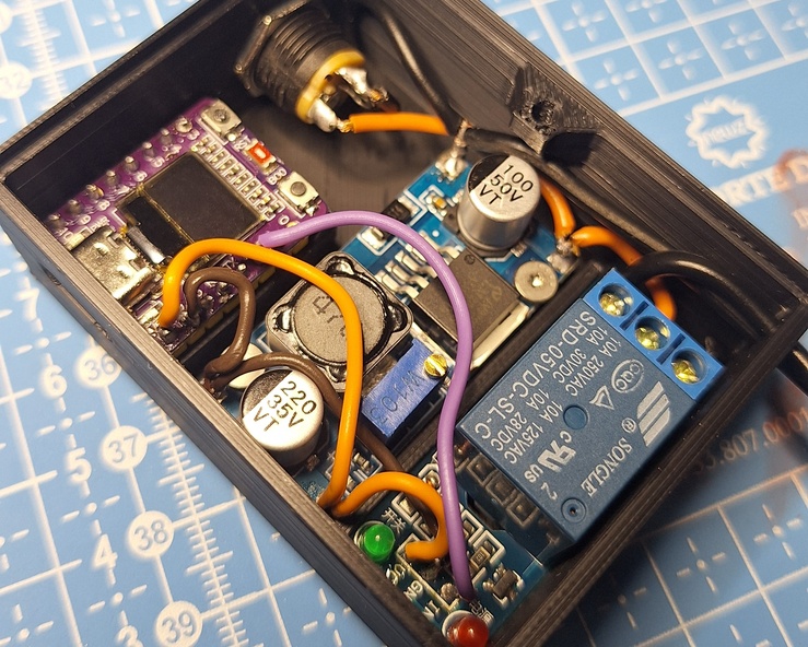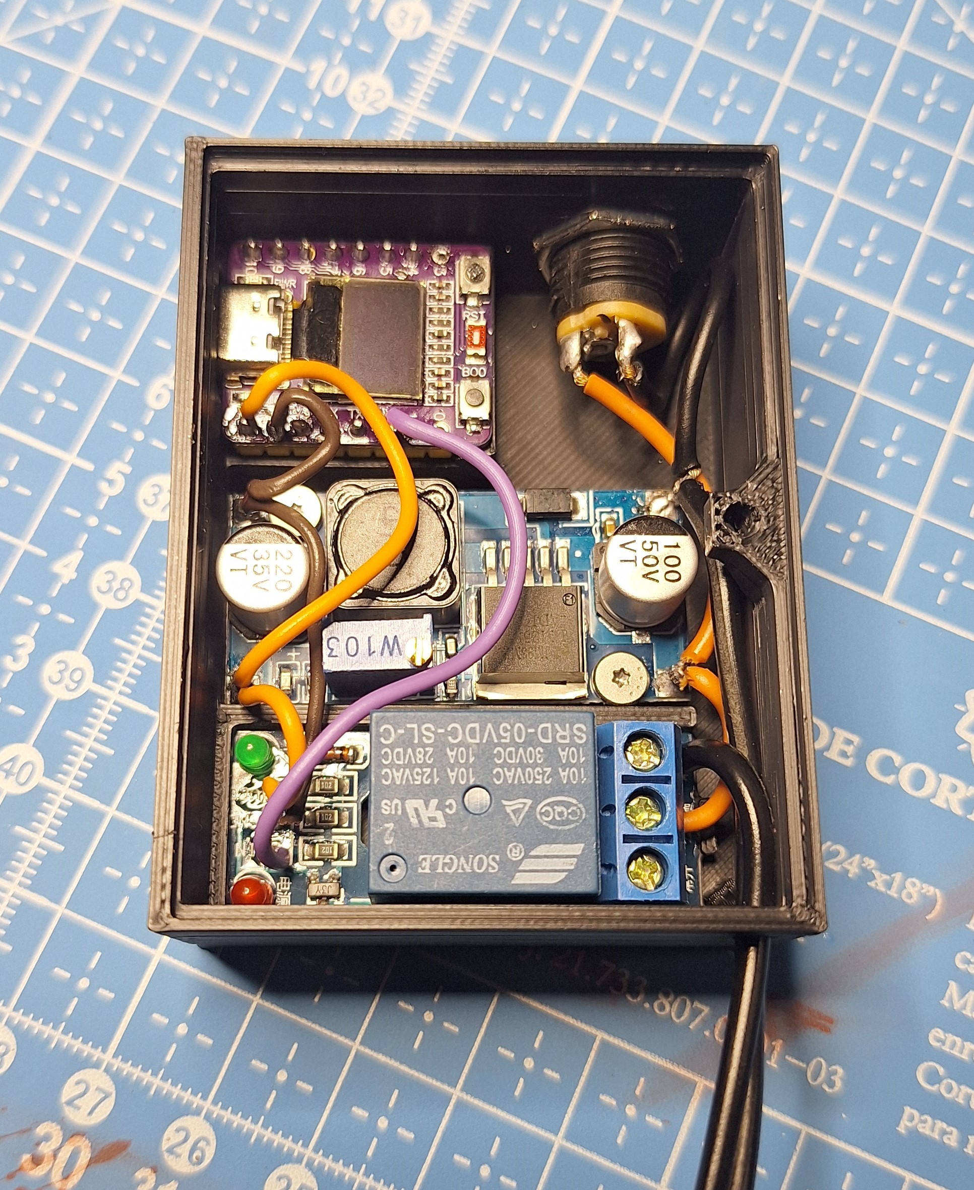 Montar o dispositivo final na caixa. O modelo 3D ficou bem apertado, então tenha paciência. São 3 parafusos: dois para o regulador de tensão e um para a tampa, mas acho que todos são dispensáveis.
