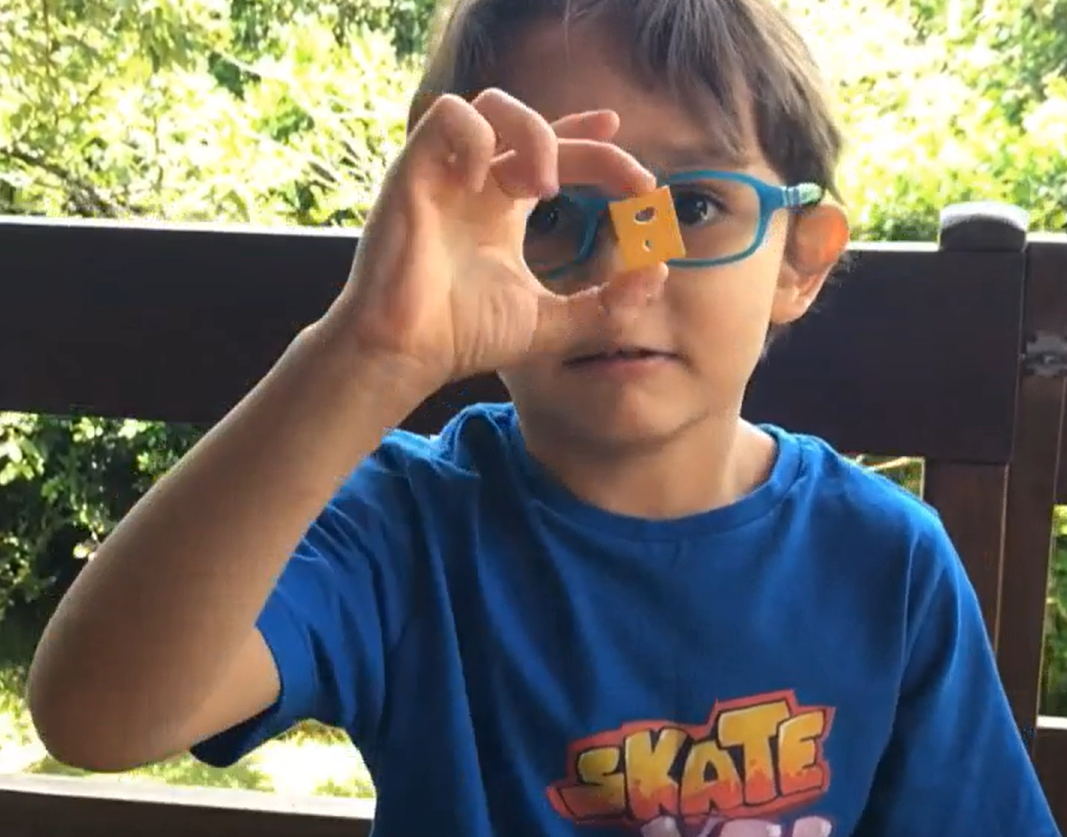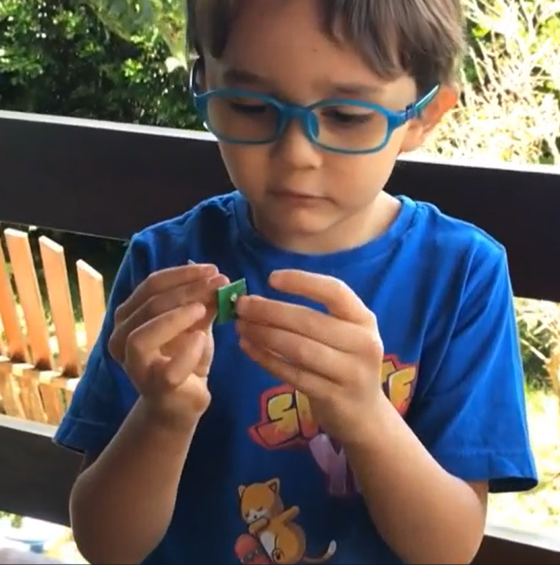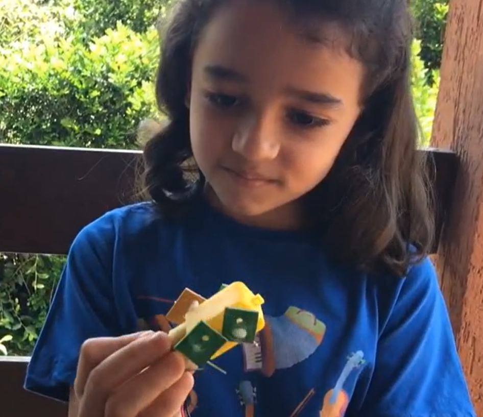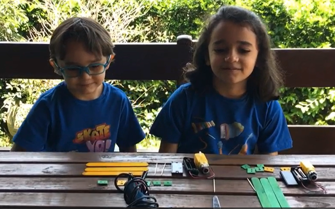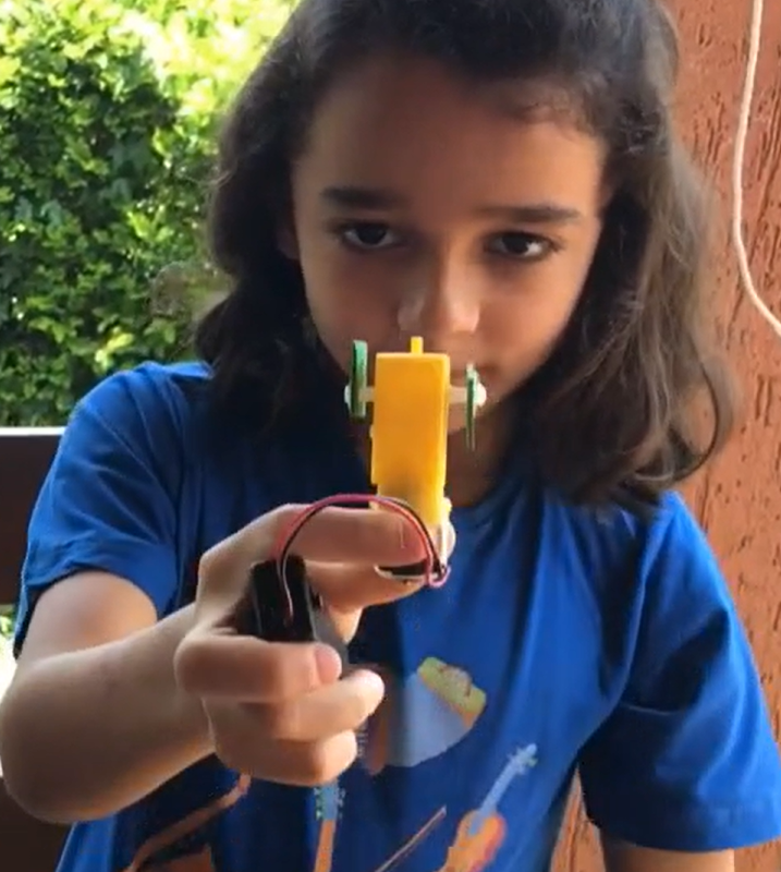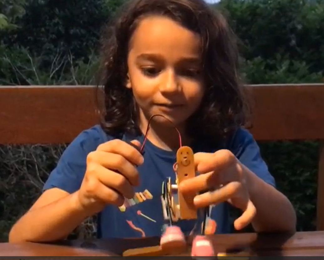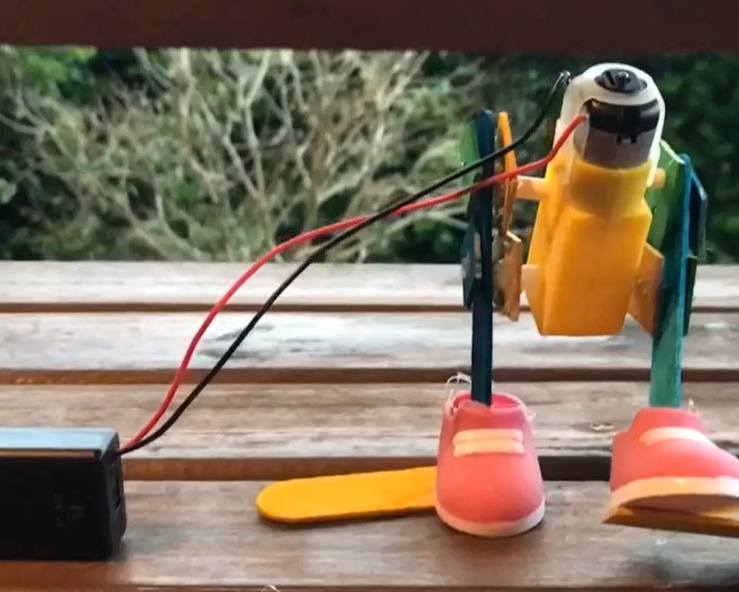 Ao ligar o motor, os quadradinhos giram alternadamente, movimentando os palitos de dente. Esse movimento é transferido para as pernas, fazendo com que uma suba enquanto a outra desce, criando o efeito de caminhada.