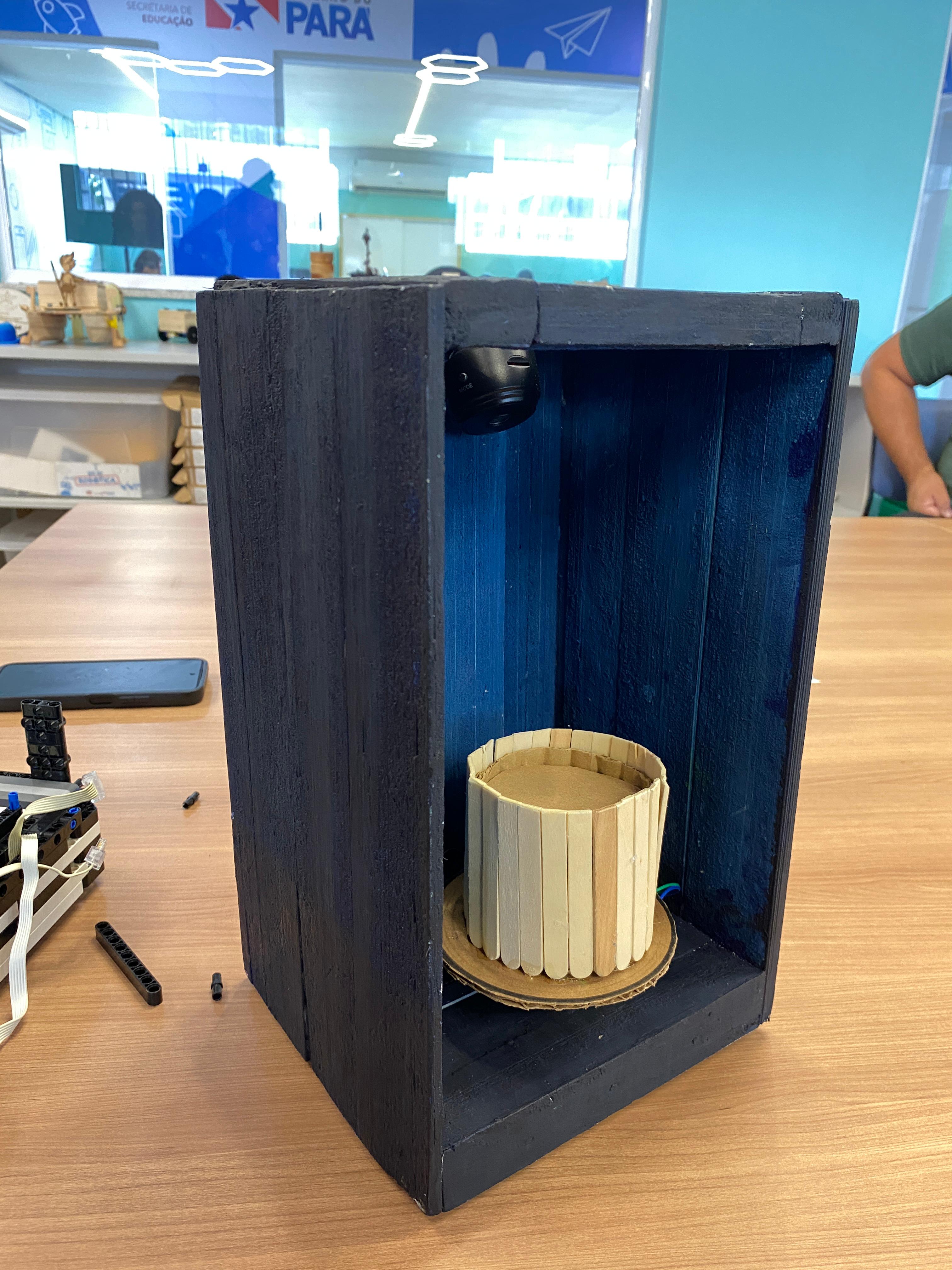 6 - Faça um pilar com o miriti e coloque dois dedos de distância da parede na parte de trás para os cabos do motor passarem.