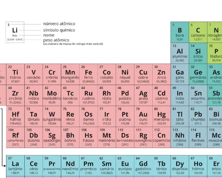 Períodos (Linhas Horizontais): São 7, indicando o número de camadas eletrônicas que o átomo possui.